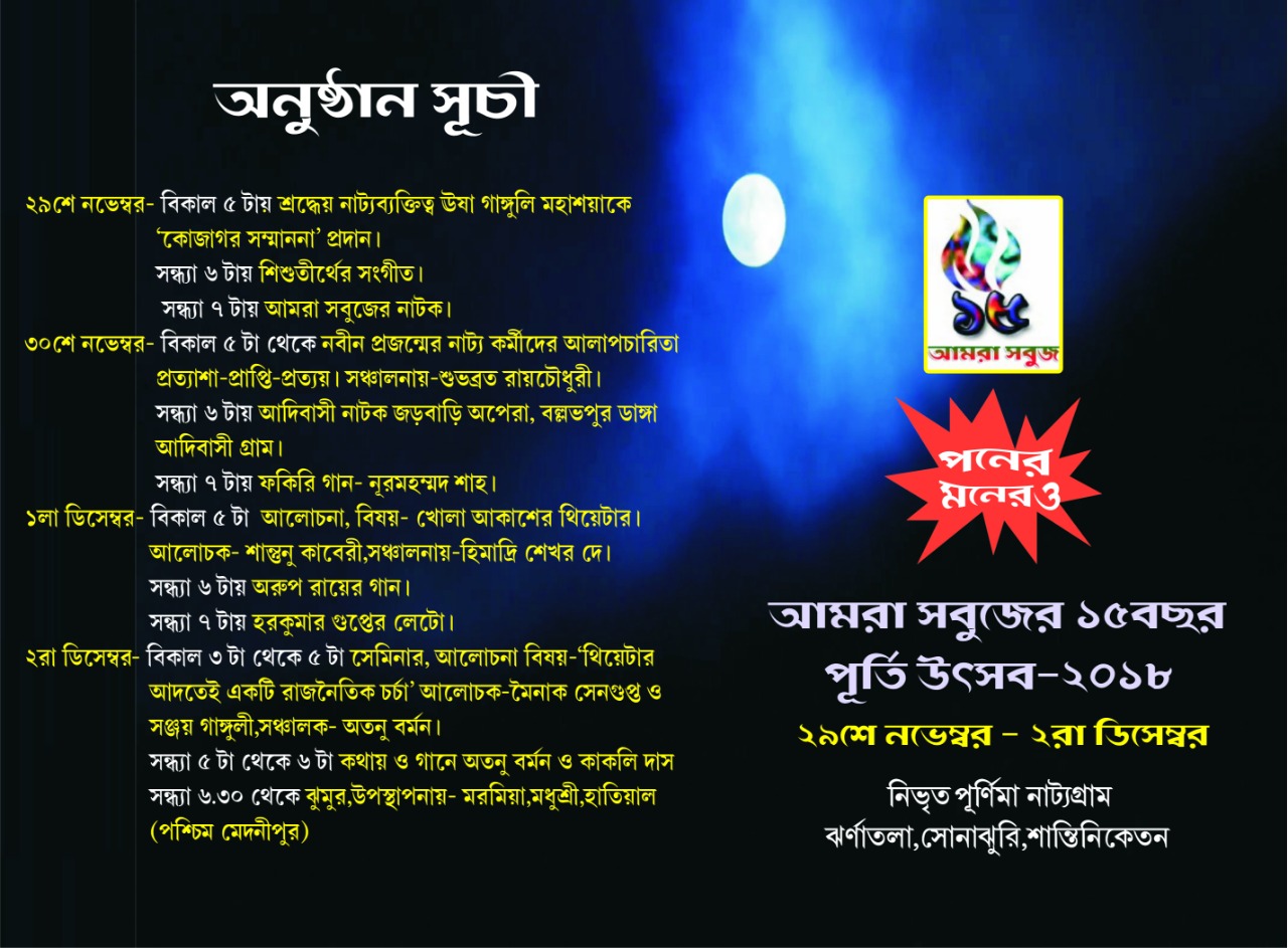 Theatre Festival of AMRA SABUJ was started in 2005 and continued till present year. It is arranged annually in Bolpur and in Santiniketan. After the death of our beloved Actrss Purnima Banerjee we have been going to observe our annual festival on 29th November in occasion of her birthday. Now the festival is held at our Theatre Village “NIVRITA PURNIMA NATYAGRAM”.Besides our theatre festival there are so many festivals are arranged throughout whole year. The festival ‘FAGUNE AGUN’ is organized in occasion of Basantotsav, and the festival ‘KASH-AKASHE’ is organized in occasion of Saradotsov.